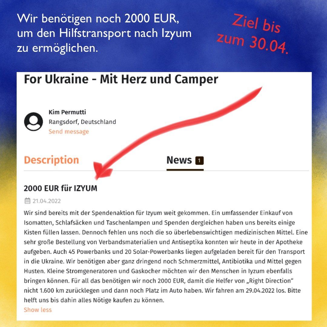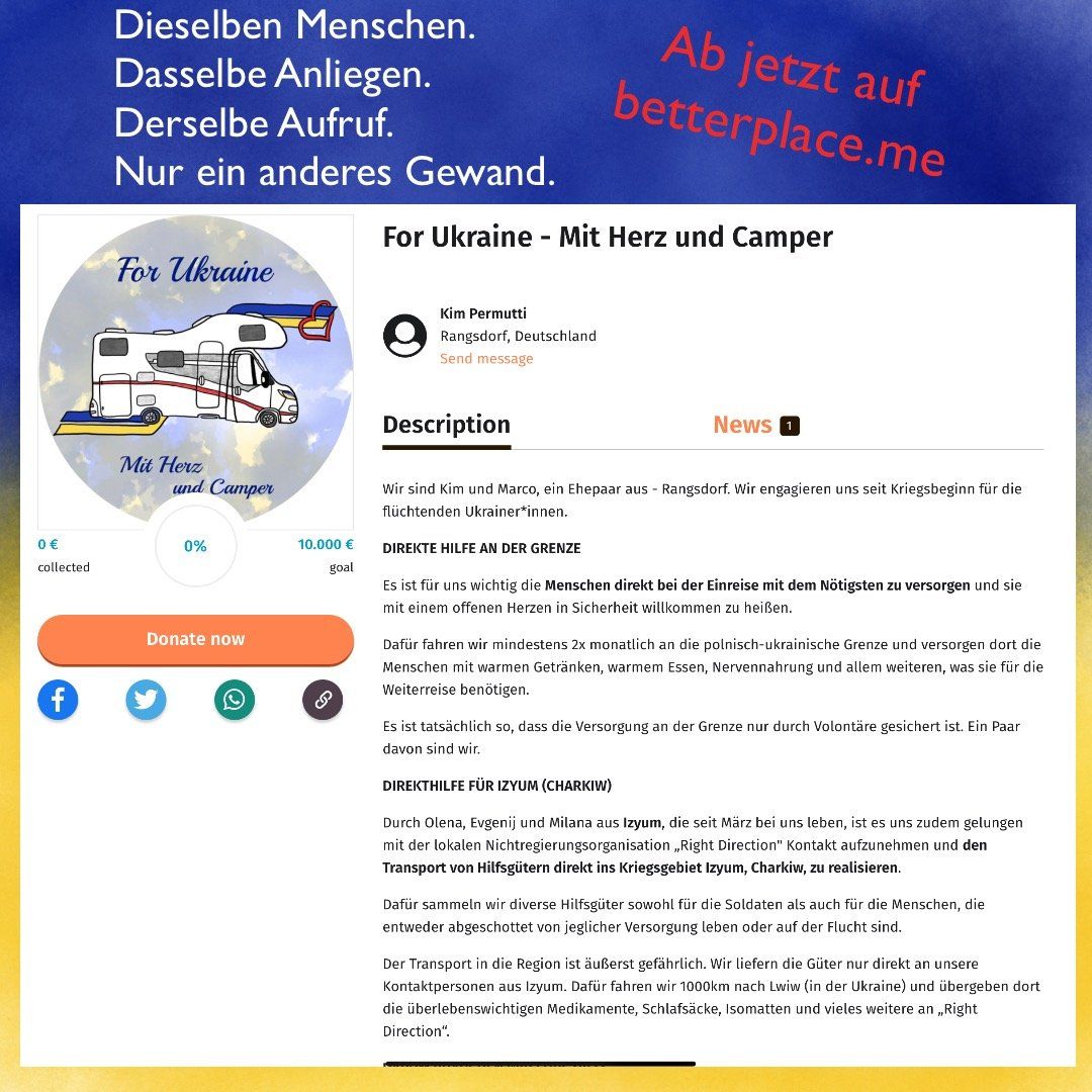 Ab sofort könnt ihr uns in unserer Überzeugung und Aktion über https://www.betterplace.me/for-ukraine-mit-herz-und-camper unterstützen.